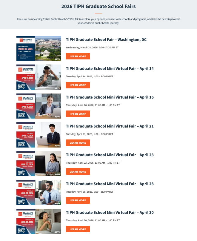 * TIPH Graduate School Mini Virtual Fair – April 30<https://aspph.org/event/tiph-graduate-school-mini-virtual-fair-april-30-2026/>