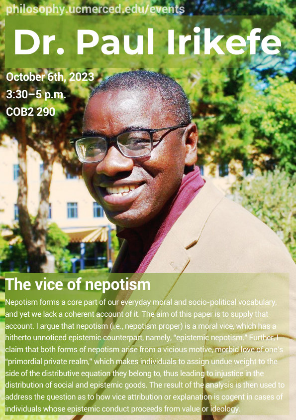 Paul Irikefe (UC Irvine) will visit us to discuss his work on "The vice of nepotism: The political, the moral, and the epistemic"