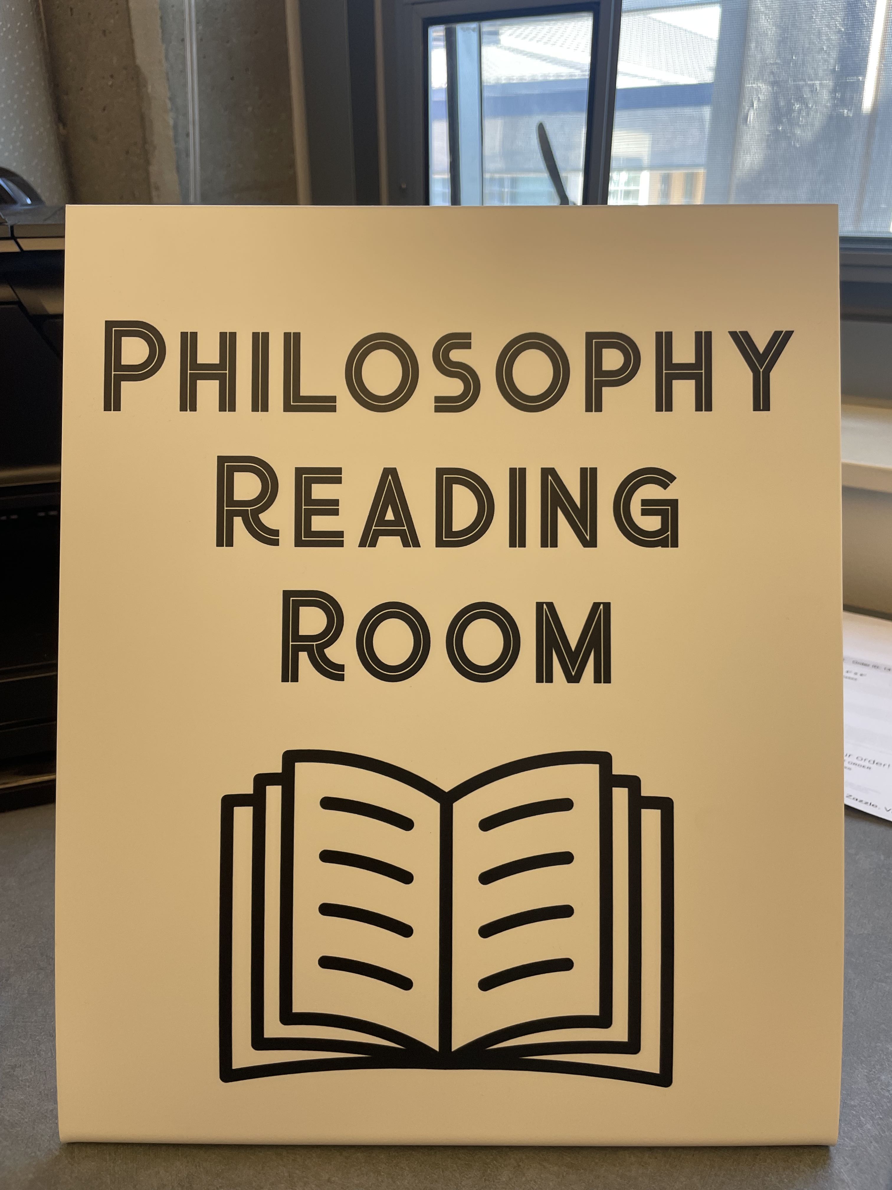 Tomorrow we will continue our weekly Reading Room in SE2 (Wednesdays from 2:30 to 4:30 p.m.). The space we have booked is on the ground floor by the windows, facing the fields; you can find us through our new sign (attached). It is a peaceful location for spending a couple of hours reading among other philosophers. We hope you will join us this or some other Wednesday this term. If your class has “enrichment,” be sure to use the sign in sheet to get credit.
