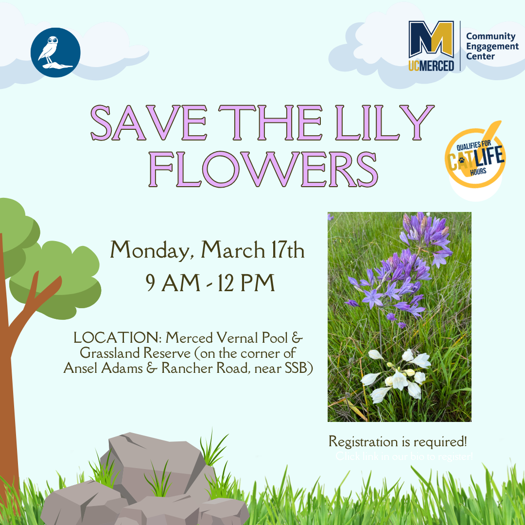 Come celebrate environmental stewardship here on campus! The UC Merced Vernal Pools and Grassland Reserve (MVPGR) will be hosting a Stewardship Day event on Monday 9am-12pm, March 17th at the MVPGR road entrance. Help us salvage and pot native lilies before road widening construction work begins over Spring Break. Let’s protect and save these beautiful lily flowers together! 🌸
