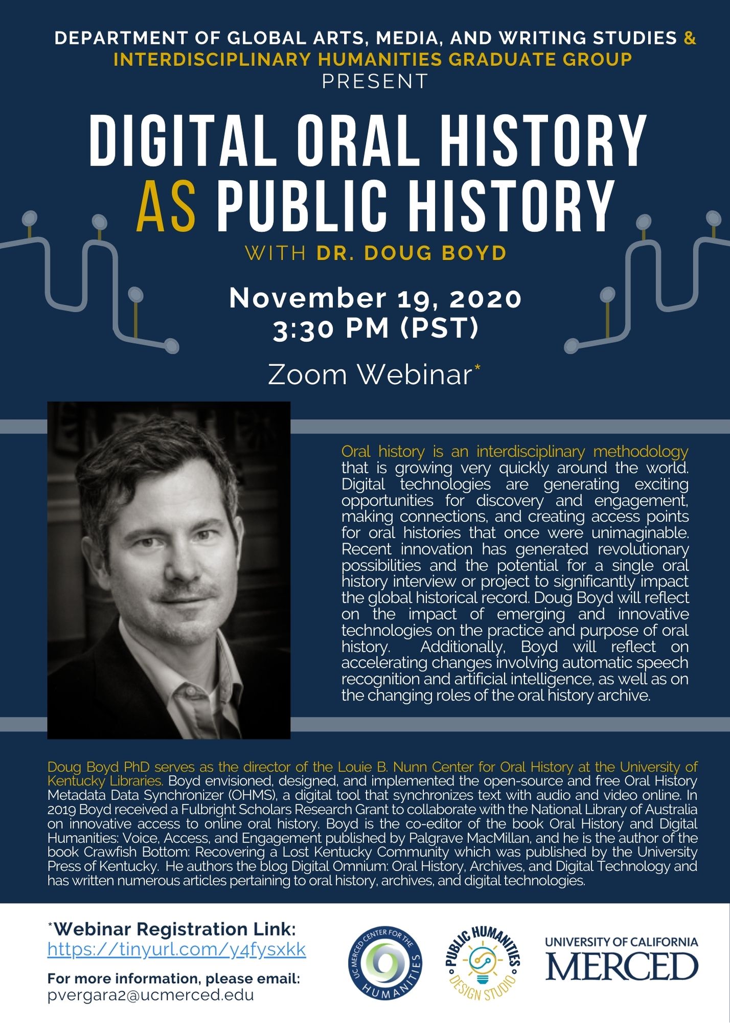 The Global Arts, Media and Writing Studies Dept. and the IH Graduate Group cordially invite you to a Zoom Webinar titled "Digital Oral History as Public History." This webinar is will take place on Thursday, November 19th at 3:30pm (PST) and you may register at https://tinyurl.com/y4fysxkk