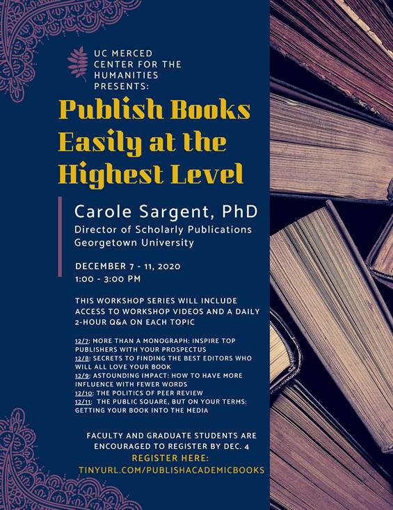 Registration for these workshops will give you access to (5) 1-hour pre-recorded videos made for UCM on book publishing topics and will also give you access to attend a 2-hour daily Q&A with Dr. Sargent on each topic. Register here<http://TINYURL.COM/PUBLISHACADEMICBOOKS> by Dec. 4.