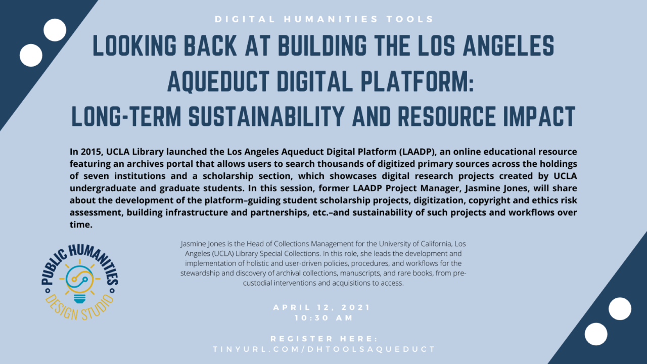 DH Tools: "Looking Back at Building the Los Angeles Aqueduct Digital Platform: Long-Term Sustainability and Resource Impact," Jasmine Jones, former LAADP Project Manager. Monday, April 12 at 10:30 a.m. Register here<https://ucmerced.zoom.us/webinar/register/WN_MAy138KZQZyE2Gw_ODJQ9g>.