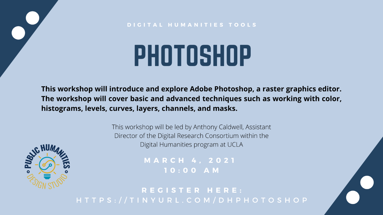 DH Tools: "Photoshop," Anthony Caldwell, Assistant Director of the Digital Research Consortium within the Digital Humanities Program, UCLA. Thursday, March 4 at 10:00 am. Register here.<https://tinyurl.com/dhphotoshop>