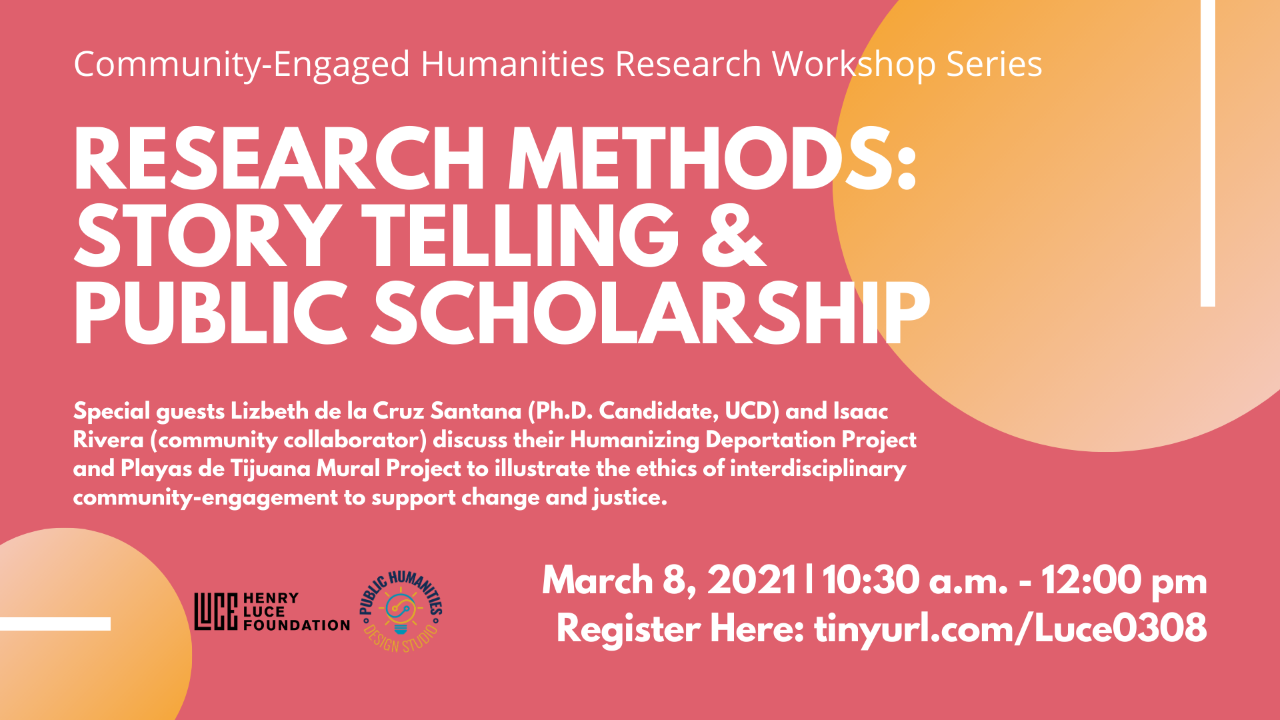 Community-Engaged Humanities Research Workshop Series: Research Methods: Storytelling & Public Scholarship. Monday, March 8 at 10:30 am. Register here.<https://tinyurl.com/luce0308>