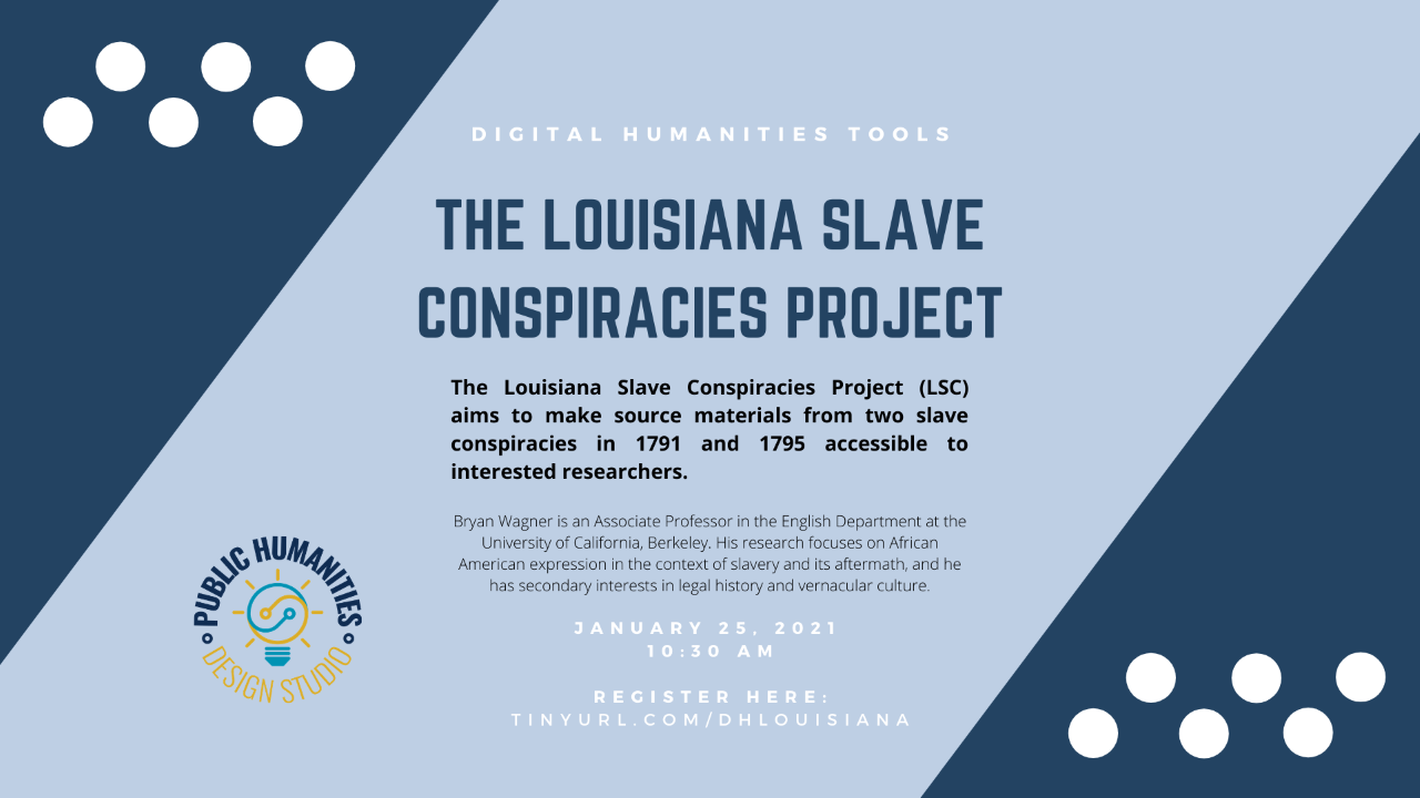 DH Tools: "The Louisiana Slave Conspiracies Project," Bryan Wagner, Associate Professor of English, UC Berkeley. Monday, January 25 at 10:30 am. Register here.<https://ucmerced.zoom.us/webinar/register/WN_No8W29ijQBWxusZqrhx8pw>