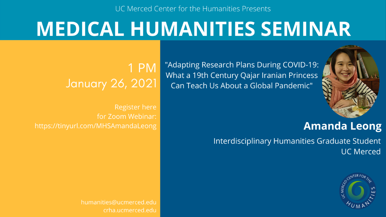 Medical Humanities Seminar: "Adapting Research Plans During COVID-19: What A 19th Century Qajar Iranian Princess Can Teach Us About A Global Pandemic," Amanda Leong, Interdisciplinary Humanities Graduate Student, UC Merced. Tuesday, January 26 at 1:00 pm. Register here.<https://ucmerced.zoom.us/webinar/register/WN_ZYO9IrpCQa6QI5h1yjHmMQ>