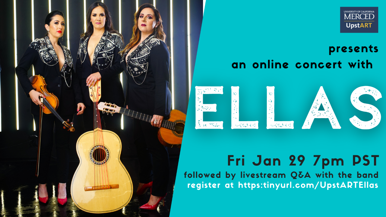 UC Merced UpstART presents a free online concert with ELLAS, followed immediately by a live Q&A with the band. Friday, January 29 at 7:00 pm. Register here.<https://ucmerced.zoom.us/webinar/register/WN_uiyr46ReQ-2k6c0nqb3STA>