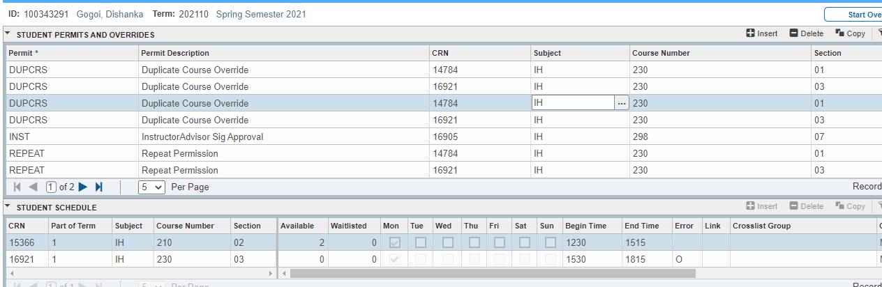 I am a 4th semester student of IH (Interdisciplinary Humanities). I am trying to register IH 230 02 ( literature and migration by Prof. Mai-Linh Hong). But while registering it is showing registration add error as ”Duplicate Course with CRN 16921 Select a Different Course. If Course Is Repeatable for Credit, then Contact Academic Advisor or School Offering Section”. PFA the screenshot.