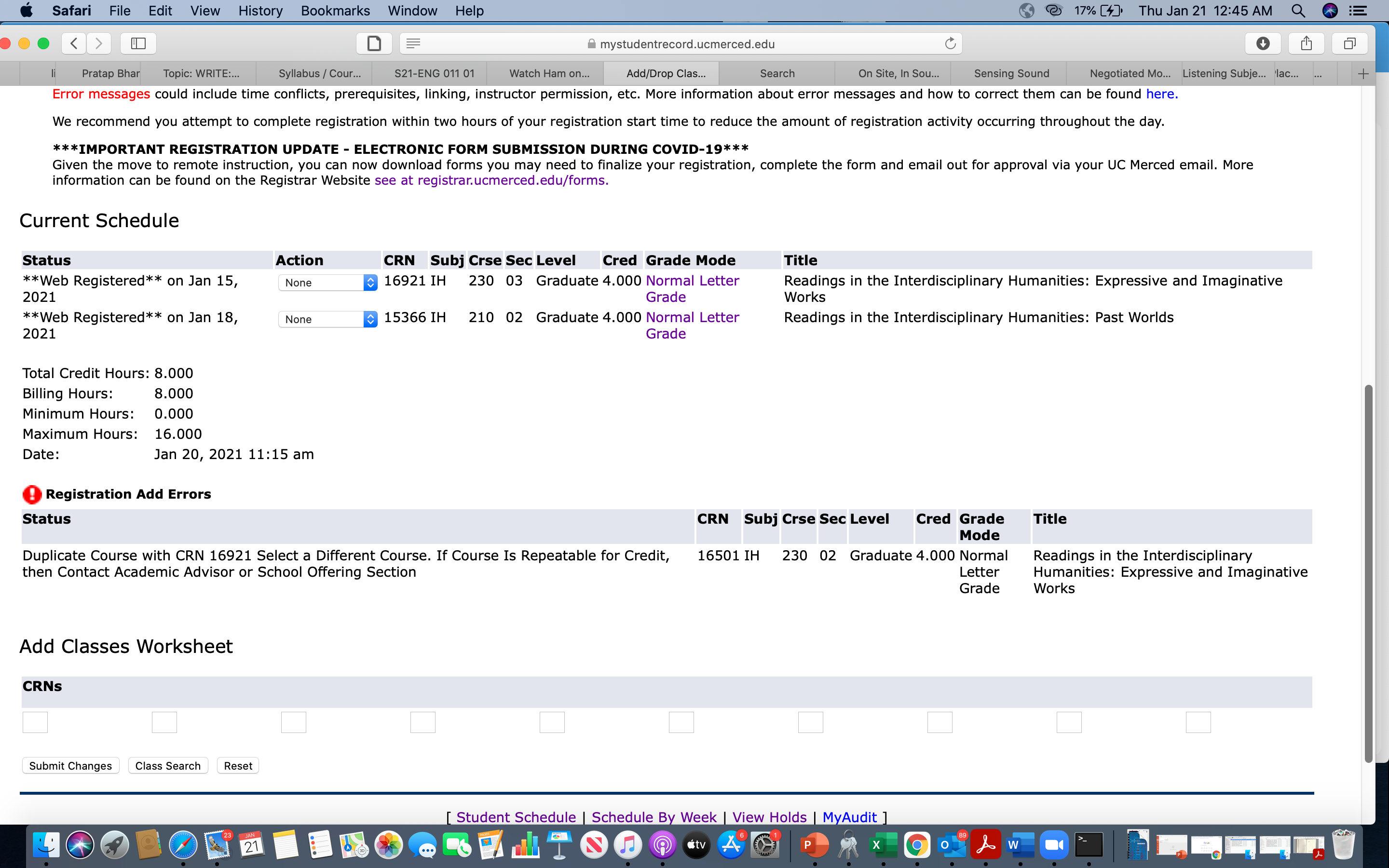 I have contacted with Monica I. Garcia, Lead Graduate Services Coordinator, Interdisciplinary Humanities, SSHA Graduate Services. She has entered all the overrides and still I can’t register. PFA the screenshot that she sent me.