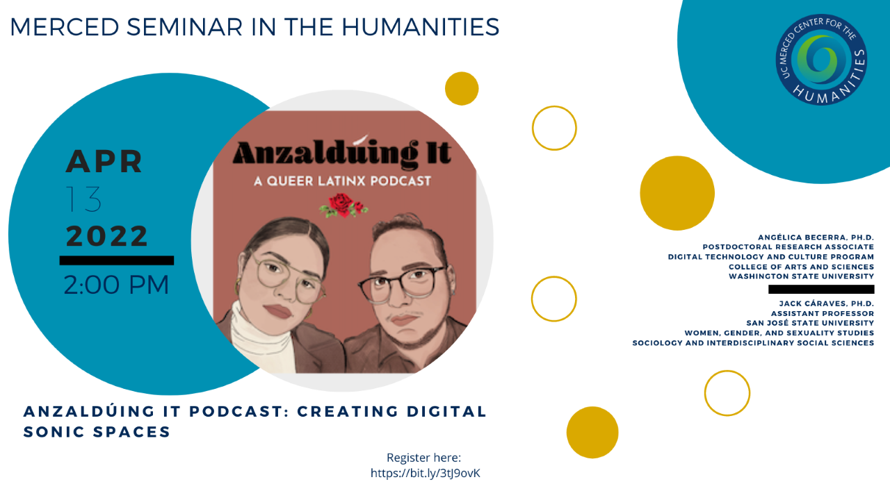 Merced Seminar in The Humanities presents “Anzaldúing It Podcast: Creating Digital Sonic Spaces" by Angélica Becerra & Jack Cáraves. April 13, 2022 at 2:00 PM via zoom. Register here<https://bit.ly/3tJ9ovK>.