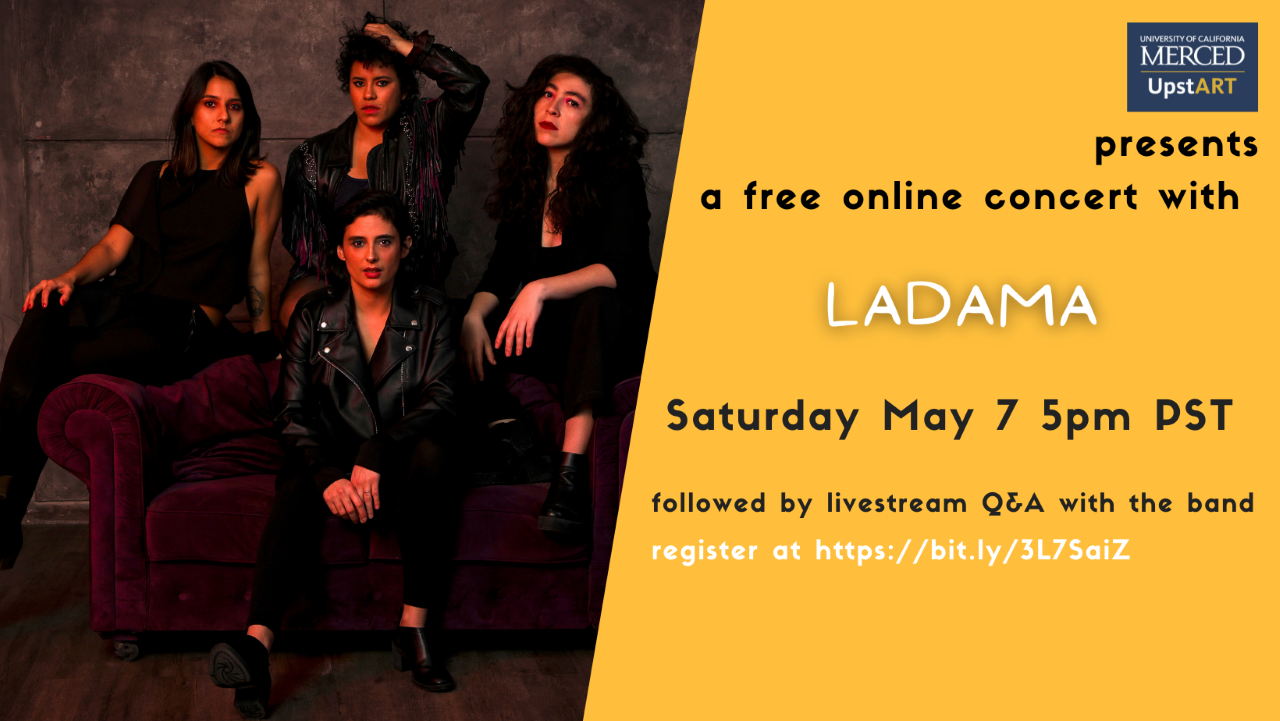 UC Merced UpstART presents a free online concert with LADAMA Saturday, May 7, 2022 at 5 pm PST immediately followed by a live Q&A with the band. Register for the event here<https://bit.ly/3L7SaiZ>.