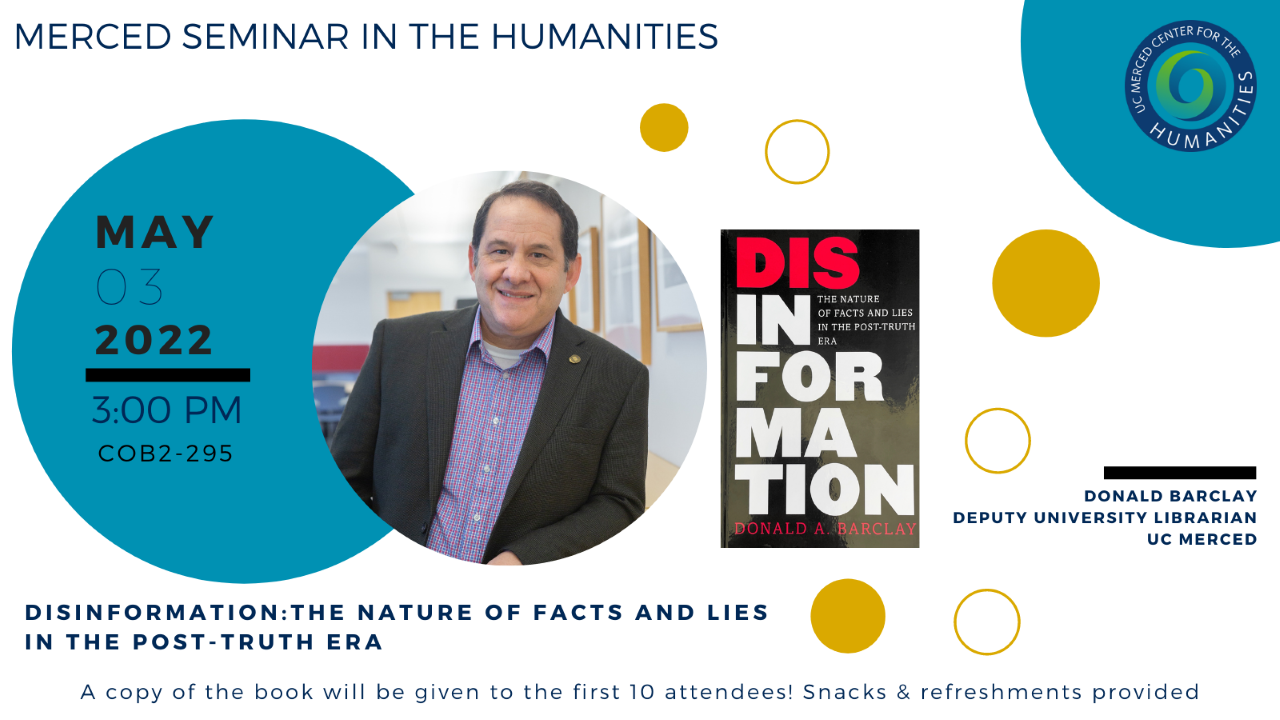 Merced Seminar in The Humanities presents “Disinformation: The Nature of Facts and Lies in the Post-Truth Era" by Donald Barclay. Tuesday, May 3, 2022 at 3:00 PM in COB 2 - 295.