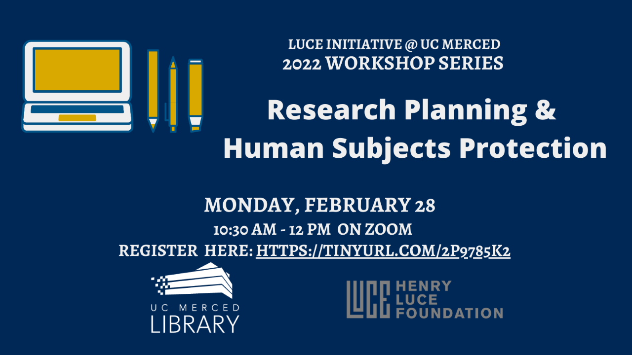 Human Subjects and Community-Engaged Research, February 28, 2022 - 10:30 AM - 12:00 PM via zoom. We will discuss Human Subjects Protection with Dr. Nigel Hatton and Danielle Dai’Re from the Office of Research Compliance and Integrity. Register here<https://ucmerced.zoom.us/meeting/register/tZUrf-qpqzIoH9J8l8YTJXq27U0-0dVxXlh2>. Organized by the Luce Initiative at UC Merced.