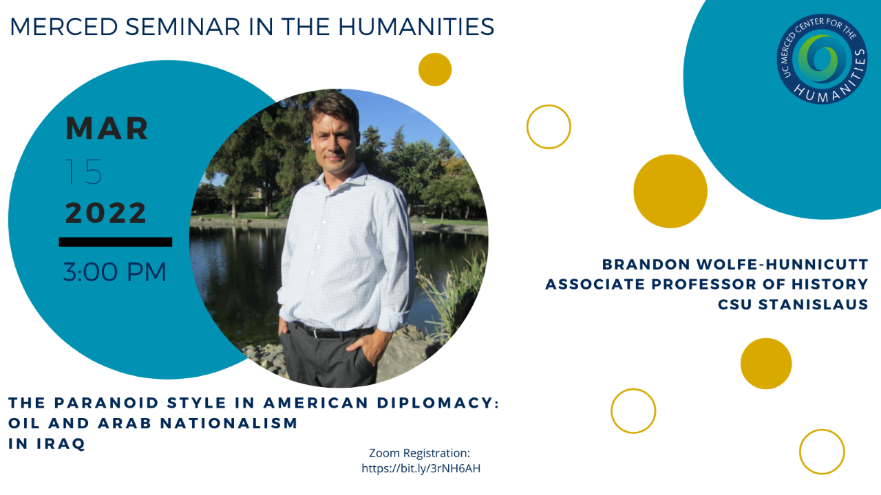 Merced Seminar in The Humanities presents “The Paranoid Style in American Diplomacy Oil and Arab Nationalism In Iraq" by Brandon Wolfe-Hunnicutt of CSU Stanislaus. March 15, 2022 at 3:00 PM via zoom. Register here<https://bit.ly/3rNH6AH>.