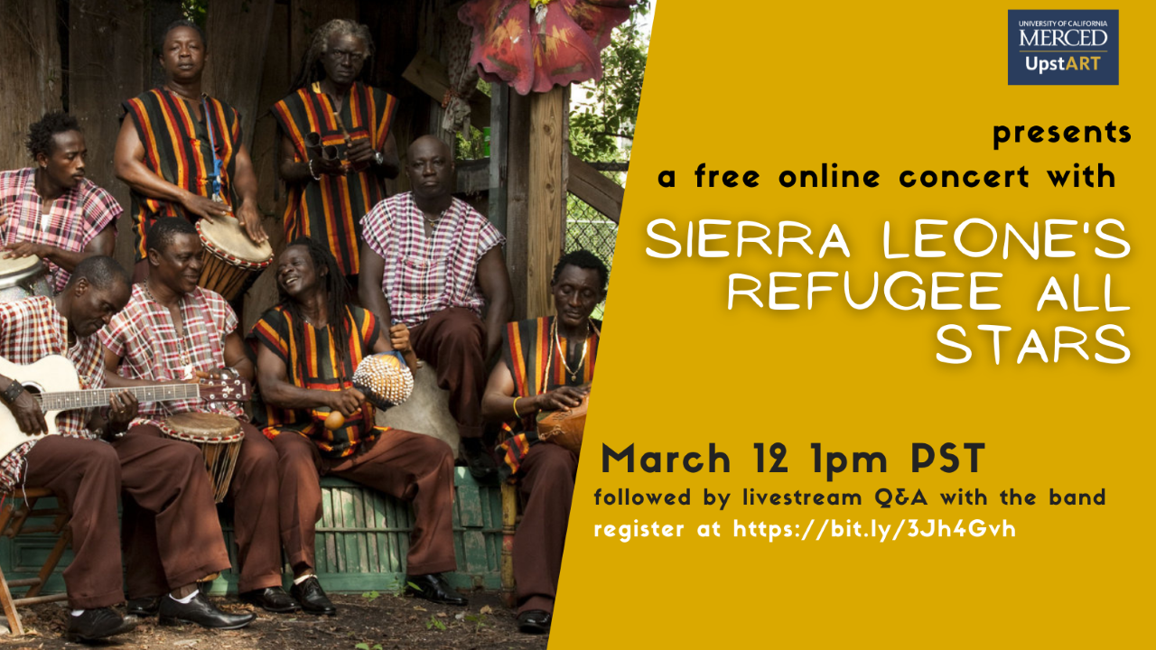 UC Merced UpstART presents a free online concert with Sierra Leone’s Refugee All Stars Saturday, March 12, 2022 at 1pm PST immediately followed by a live Q&A with the band. Register for the event here<https://bit.ly/3Jh4Gvh>.