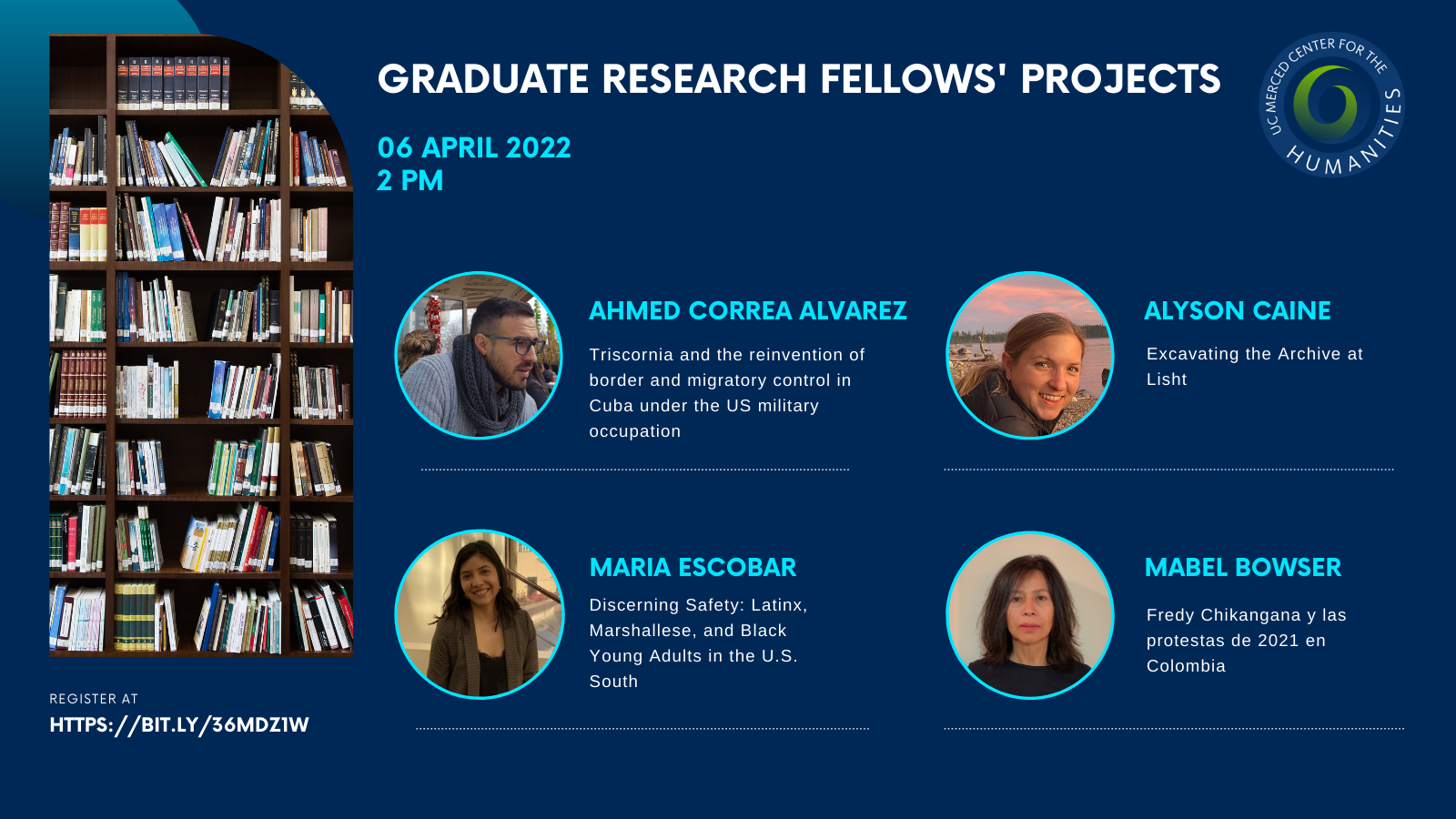Merced Seminar in The Humanities presents “Graduate Research Fellows' Projects" by 2021-2022 fellowship recipients. April 6, 2022 at 2:00 PM via zoom. Register here<https://ucmerced.zoom.us/webinar/register/WN_ZugyMoPCQlauStsezmaEfw>.