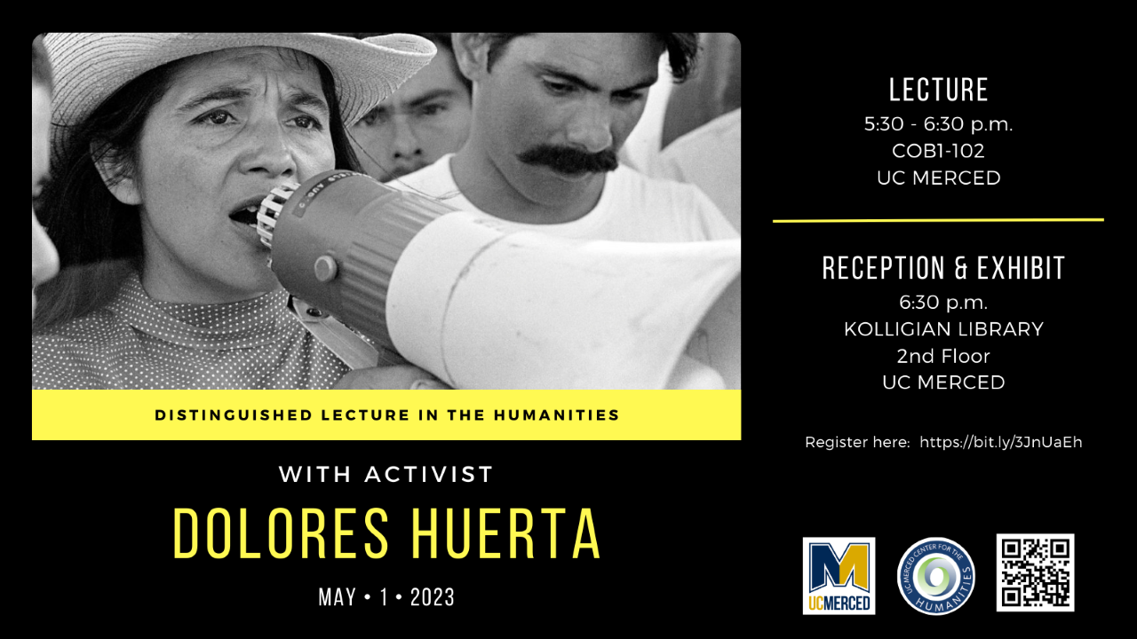 [Dolores Huerta holding a bullhorn. Heading below reads "Distinguished Lecture in the Humanities with Activist Dolores Huerta May 1, 2023." Heading to the right reads "Lecture 5:30 PM COB1-102 UC Merced. Below another heading reads, "Reception & Exhibit 6:30 PM Kolligian Library 2nd floor UC Merced. Register here: https://bit.ly/3JnUaEh. Followed by UC Merced and Center for the Humanities logos, and QR code. Black background with yellow accents.]