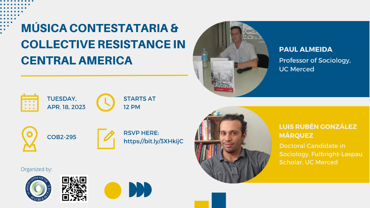 [Heading reads "Música Contestataria & Collective Resistance in Central America." Paul Almeida, Professor of Sociology, UC Merced & Luis Rubén González Márquez, Doctoral Candidate in Sociology, Fulbright Laspau Scholar, UC Merced. Tuesday, Apr. 18, 2023 at 12:00 PM in COB2-295. RSVP here: https://bit.ly/3XHkijC. Organized by: the Center for the Humanities logo. QR code. Blue and gold abstract background.]