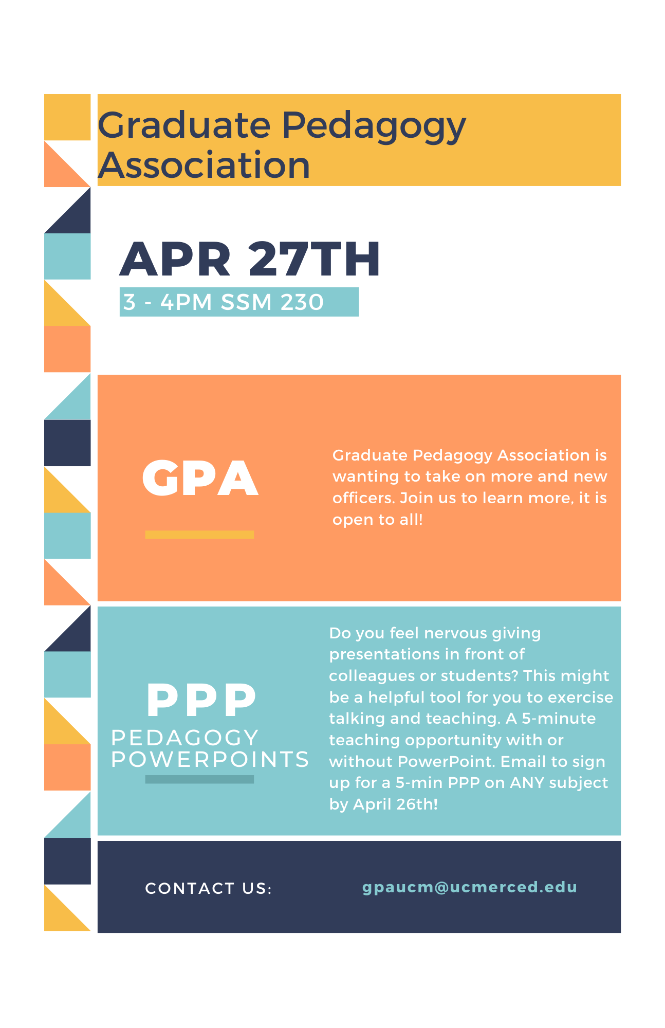 Graduate pedagogy association is hosting an event April 27th 3- 4pm in SSM 230!