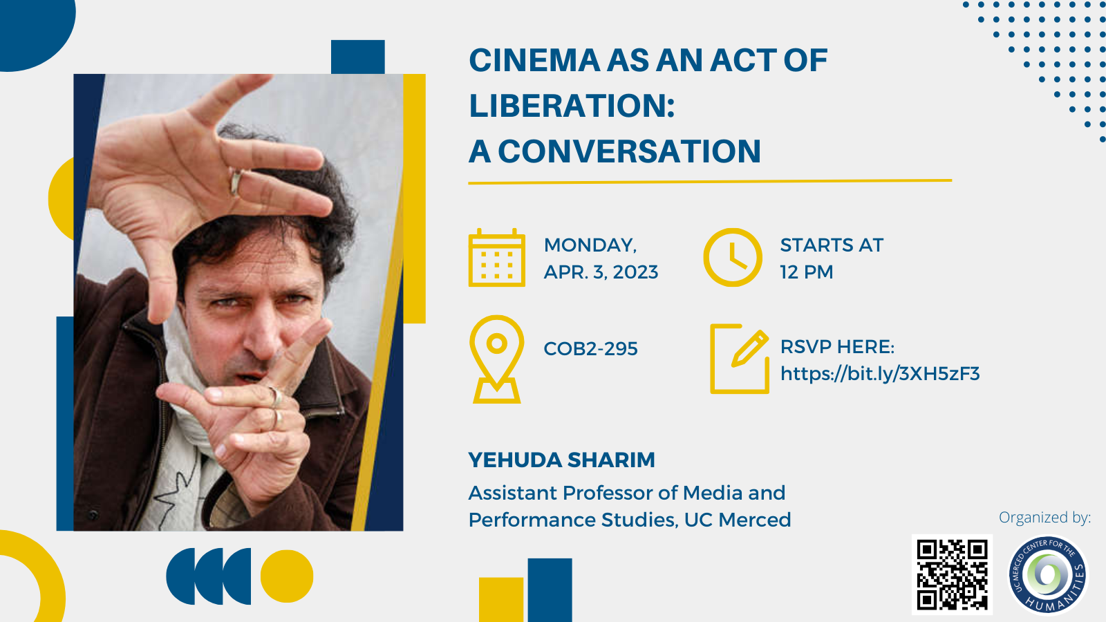 Cinema as an Act of Liberation: A Conversation with Yehuda Sharim, Monday, Apr. 3, 2023 at 12:00 PM in COB2-295. Coffee & snacks will be provided! RSVP here<https://bit.ly/3XH5zF3>