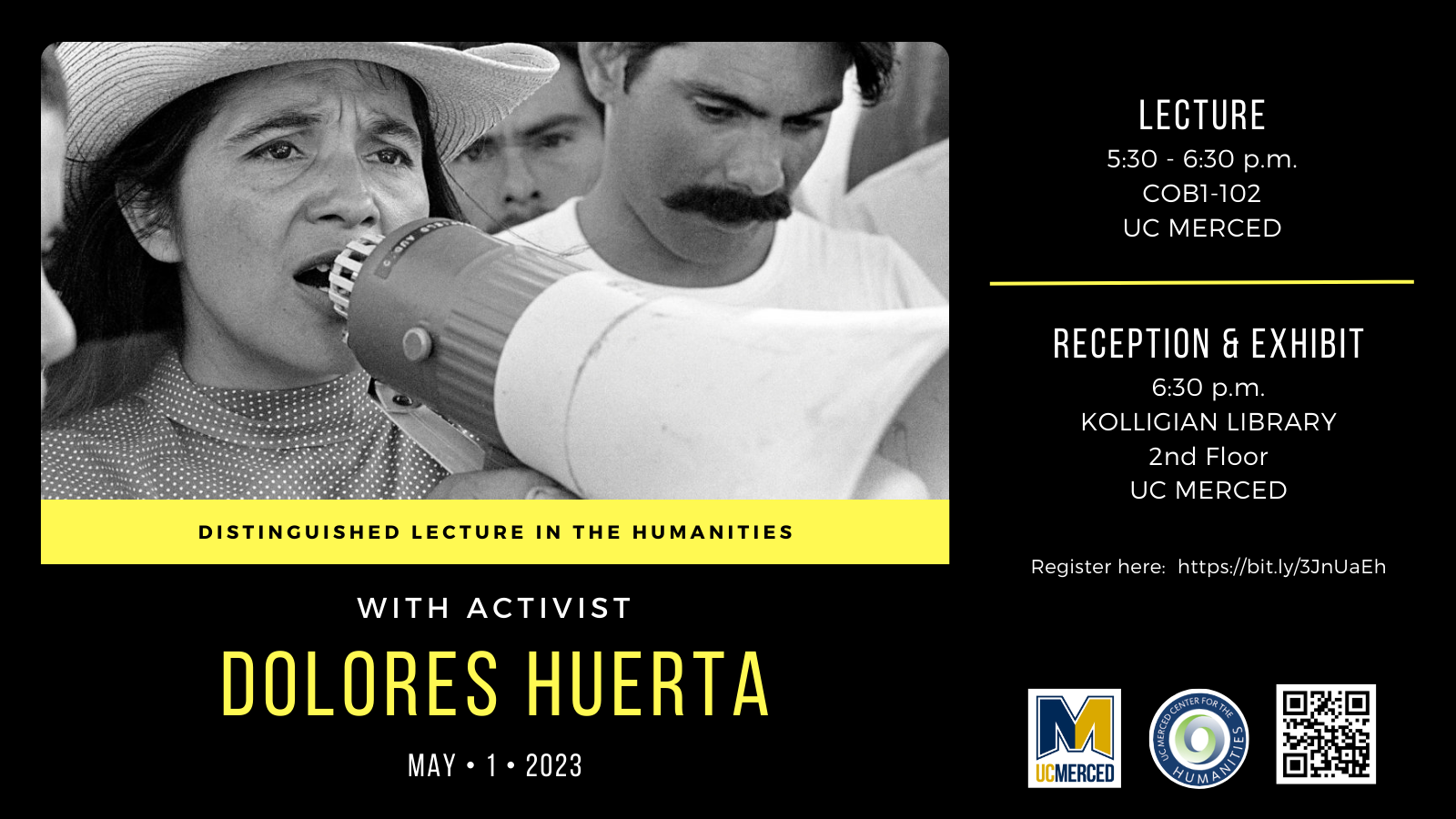 Please save the date for our Distinguished Lecture in the Humanities with Dolores Huerta, Monday, May 1, 2023 at 5:30 PM in COB1-102, followed by an exhibit & reception in the Kolligian Library on the 2nd floor at 6:30 PM. RSVP here<https://bit.ly/3JnUaEh>.