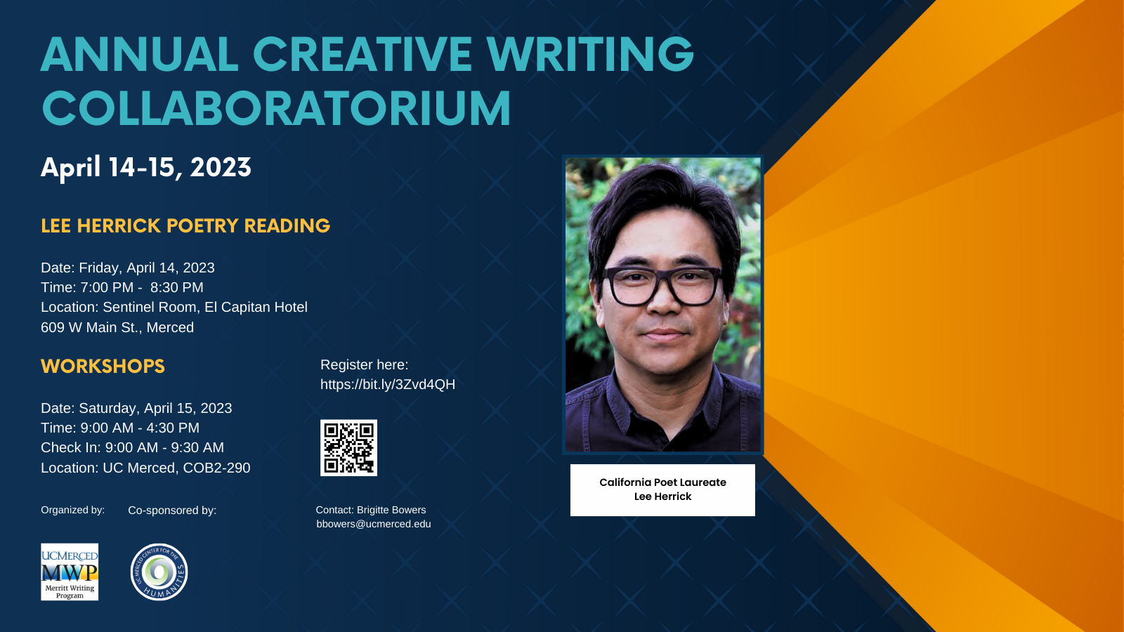 Annual Creative Writing Collaboratorium with poetry reading by Lee Herrick, Friday, Apr. 14, 2023 at 7:00 PM in El Capitan Hotel, Sentinel Room. Writing Workshops will be on Saturday, Apr. 15, 2023, check in will be in COB2-290 from (9:00 AM - 9:30 AM). Register here<https://bit.ly/3Zvd4QH>.