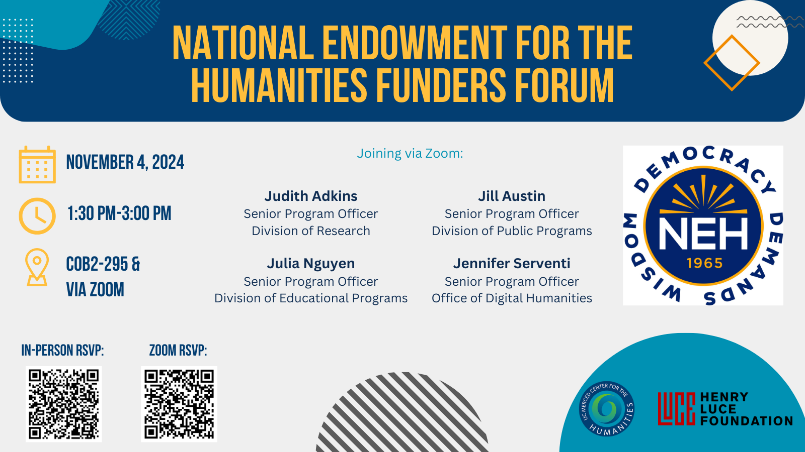 "National Endowment for the Humanities Funders Forum," Nov. 4, 1:30 PM, COB2-295 (RSVP here to attend in person<http://bit.ly/4hnzOv1>) and via Zoom (RSVP here<https://bit.ly/4fhhYbp>).