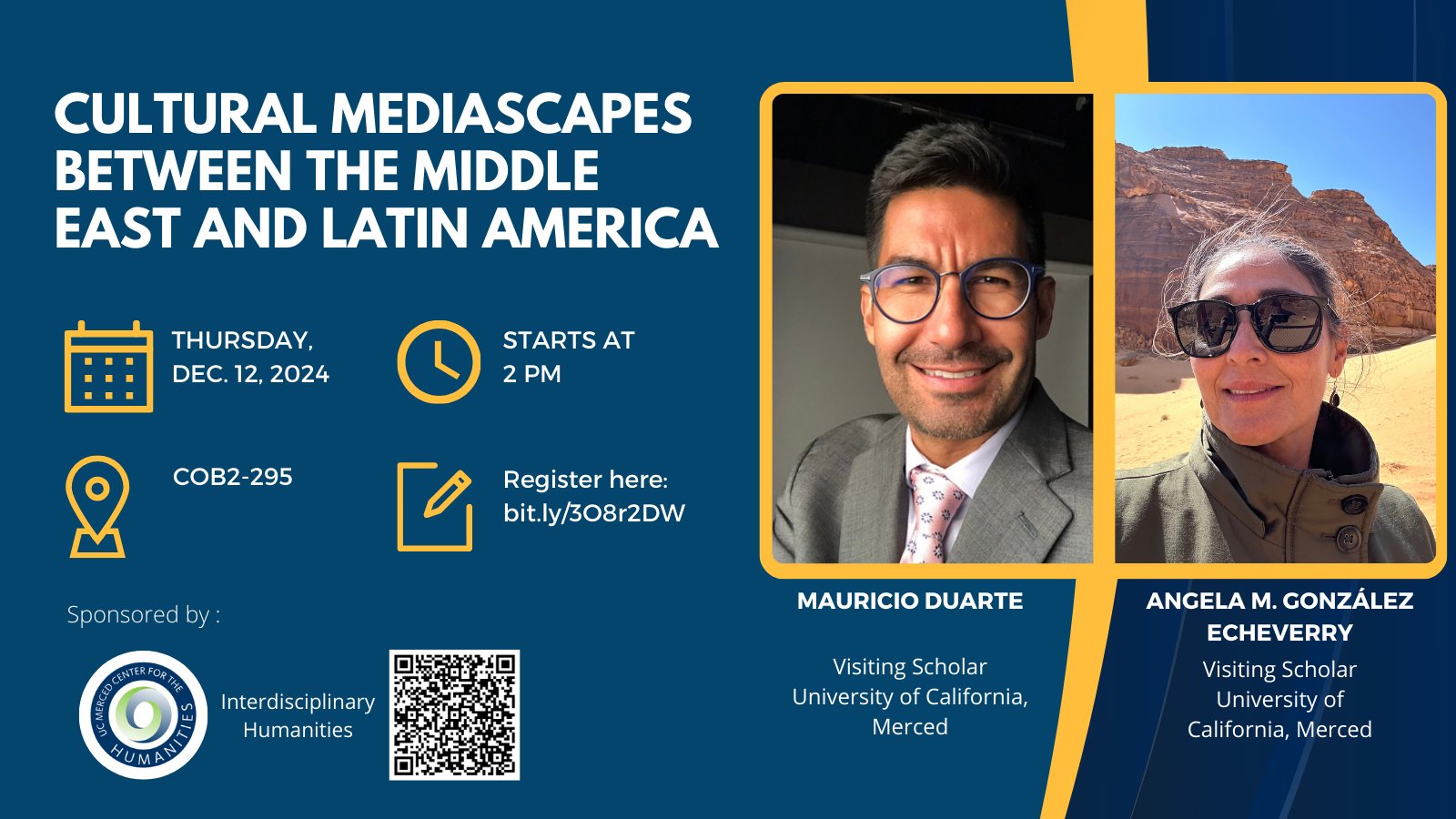 "Cultural Mediascapes between the Middle East and Latin America," with Mauricio Duarte & Angela M. González Echeverry, Thur. Dec. 12, 2:00 PM in COB2-295. RSVP here<https://centerforhumanities.ucmerced.edu/form/rsvp-cultural-mediascapes-between-middle-east-and-latin-america>. Co-sponsored by Interdisciplinary Humanities.