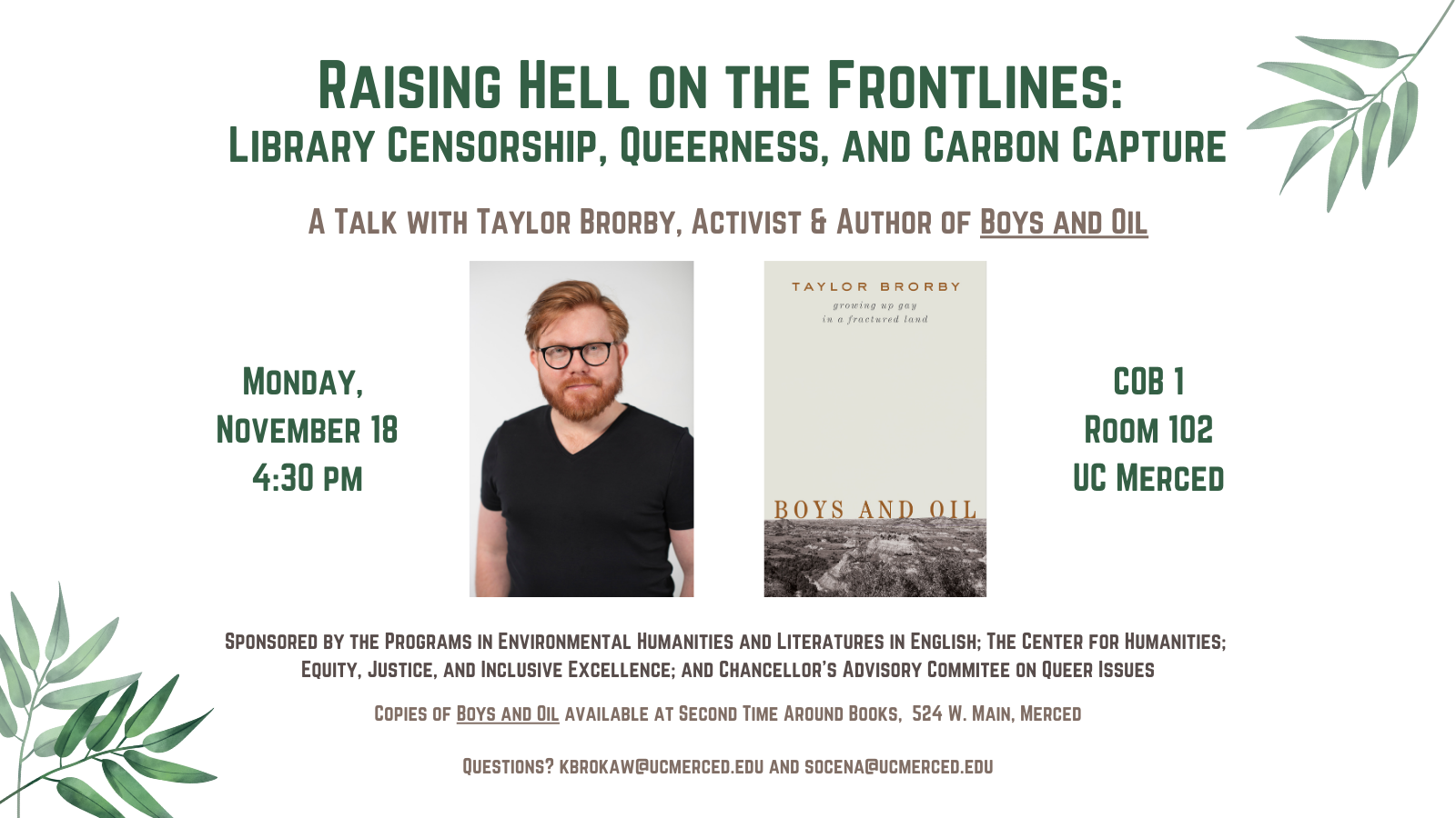 "Raising Hell on the Frontlines: Library Censorship, Queerness, and Carbon Capture," with Taylor Brorby, Mon. Nov. 18, 4:30 PM in COB1-102. Co-sponsored event.