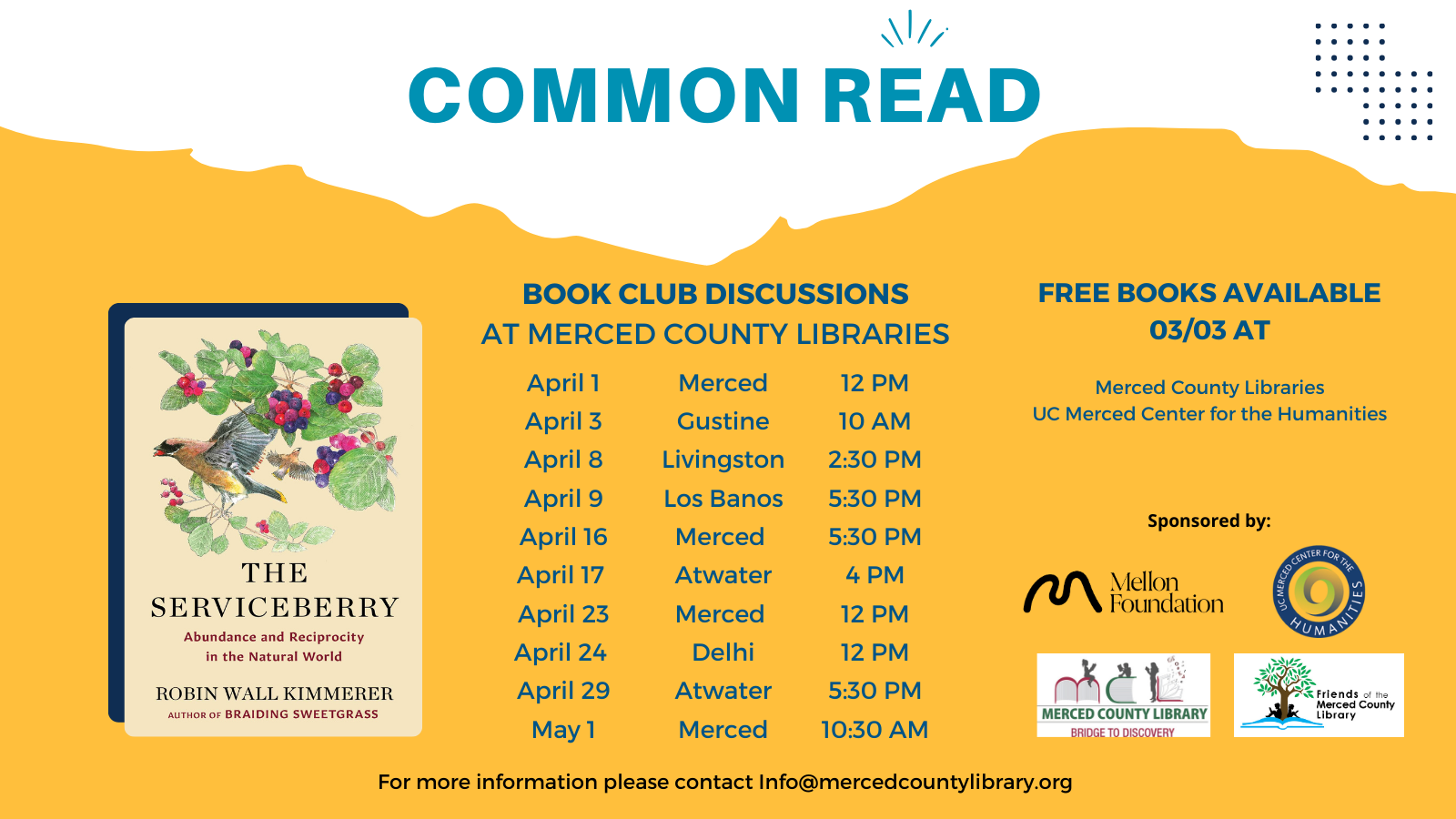 Our Common Read book, The Serviceberry: Abundance and Reciprocity in the Natural World, by Robin Wall Kimmerer is available for pickup at UC Merced's Center for the Humanities (one copy per person). Community Book Club Discussions will be held in April and May at Merced County Libraries.