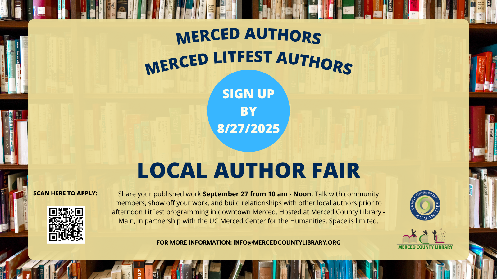 We would like to invite you to consider tabling at our 4th Annual Local Author Fair, held at the Merced County Main Library on September 27, 2025. To sign up, please complete the short registration form by Aug. 27: