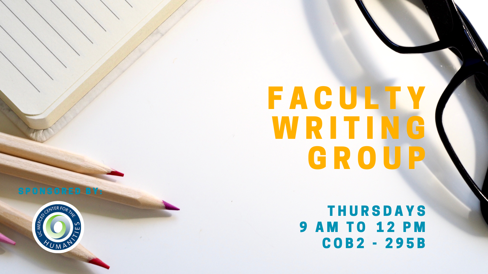 [White background with color pencils and a pair of glasses to the right of the photo. Event title: Faculty Writing Group. Time: Thursdays 9 AM to 12 PM. Location: COB2-295B.]
