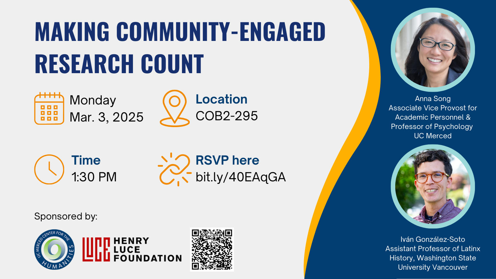 [Event information: "Making Community-Engaged Research Count" is scheduled for Monday, March 3, 2025, at 1:30 PM in COB2-295. Speaker one: Anna Song. Speaker one title: Associate Vice Provost for Academic Personnel & Professor of Psychology, UC Merced. Speaker two: Iván González-Soto. Speaker two title: Assistant Professor of Latinx History, Washington State University Vancouver. RSVP here: bit.ly/40EAqGA. Sponsored by UC Merced Center for the Humanities and Henry Luce Foundation. Image Description: The poster has a grey left section and a deep blue right section, with a curved gold accent. On the right-hand side are two circular portraits of Professor Anna Song and Professor Iván González-Soto. In the lower left-hand corner, there is a Center for the Humanities logo and Henry Luce Foundation logo. In the bottom middle of the page there is a QR code to RSVP.]