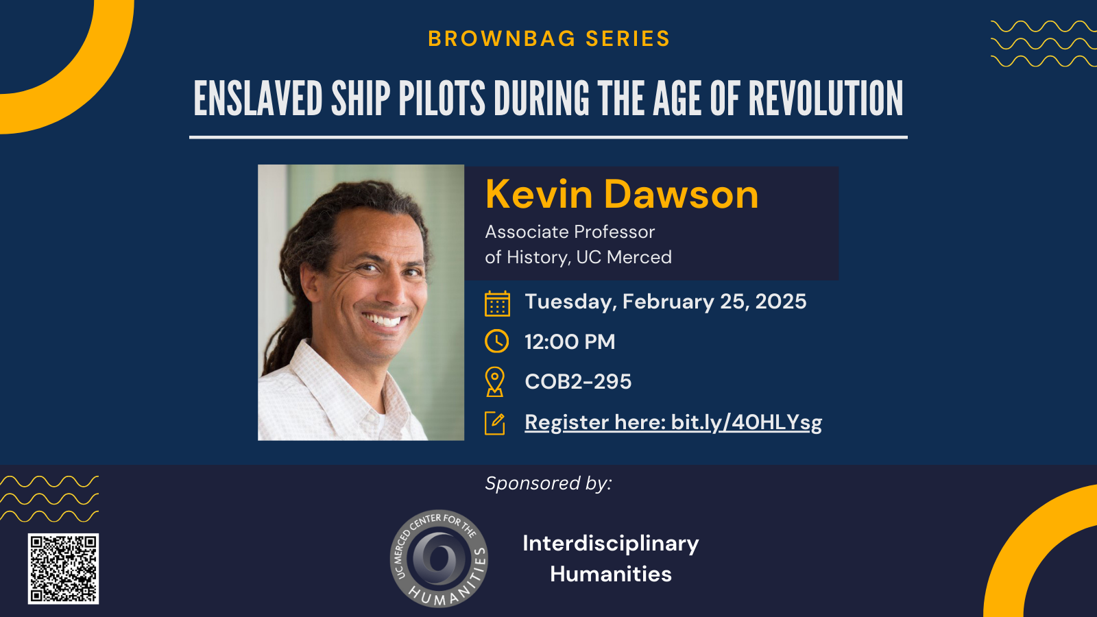 [Event Information: Brownbag Series "Enslaved Ship Pilots During the Age of Revolution," Speaker: Kevin Dawson. Speaker title: Associate Professor of History at UC Merced. Event date: Tuesday, February 25, 2025. Event time: 12:00 PM. Event Location: COB2-295. RSVP here: bit.ly/40HLYsg. Sponsored by The UC Merced Center for the Humanities and Interdisciplinary Humanities. Image Description: The poster has a blue background with golden rings in the upper left and lower right corners. Golden wave icons in the upper right-hand corner and lower left-hand corner. In the middle is a rectangular portrait of Professor Kevin Dawson. In the lower left-hand corner, there is a QR code to RSVP. In the lower right-hand corner, there is a grey Center for the Humanities logo and Interdisciplinary Humanities in white text.]