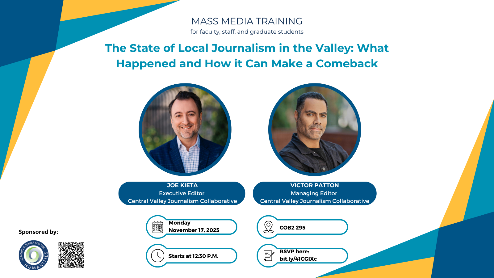 "The State of Local Journalism in the Valley: What Happened and How it Can Make a Comeback," Joe Kieta and Victor Patton, Nov. 17, 12:30 PM, COB2-295. RSVP here<https://centerforhumanities.ucmerced.edu/form/rsvp-state-local-journalism-valley-what-happened-and-how-it-can-make-comeback>.
