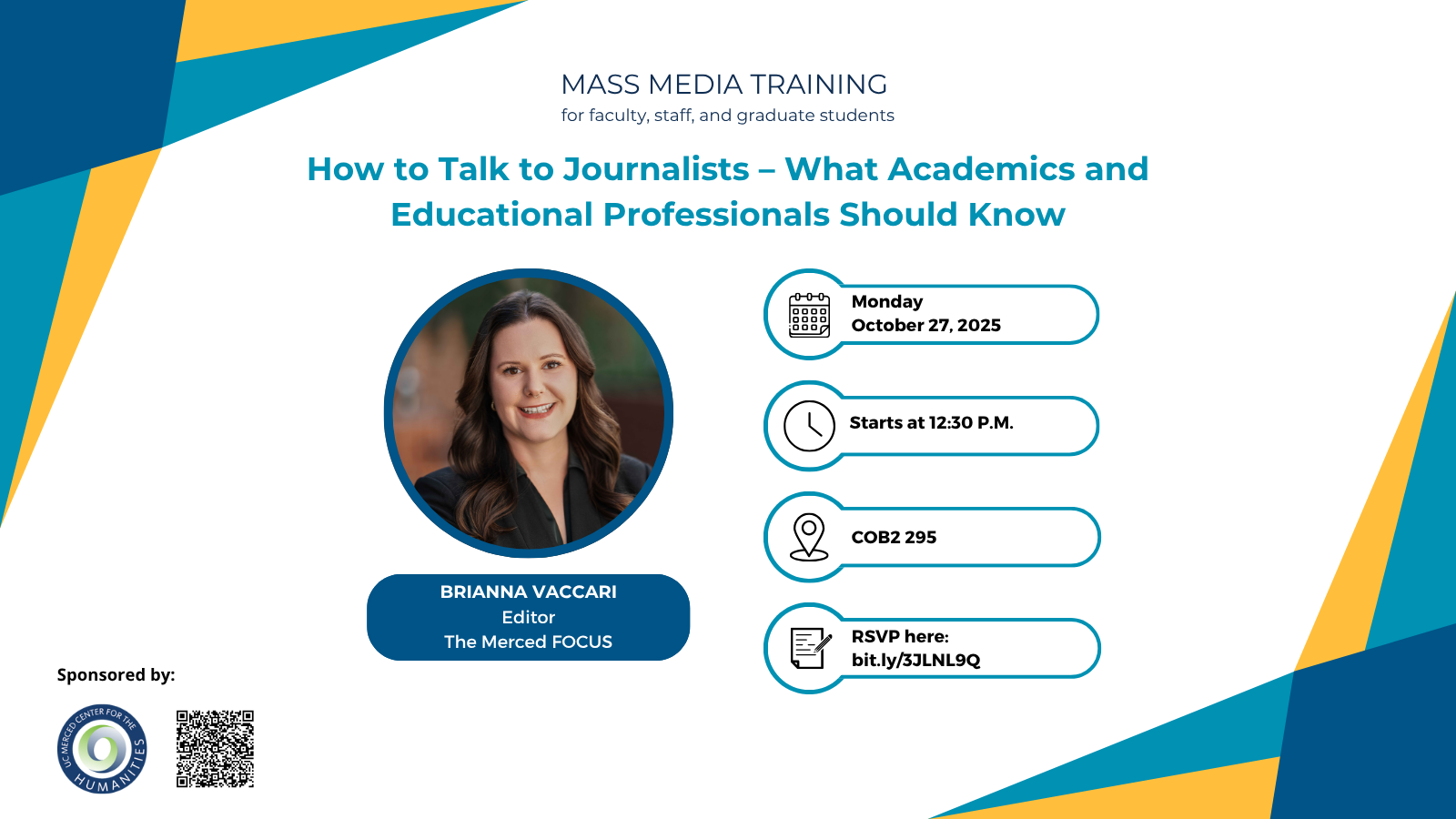 "How to Talk to Journalists – What Academics and Educational Professionals Should Know," Brianna Vaccari, Oct. 27, 12:30 PM, COB2-295. RSVP here<https://centerforhumanities.ucmerced.edu/form/rsvp-how-talk-journalists-%E2%80%93-what-academics-and-educational-professionals-should-know>.