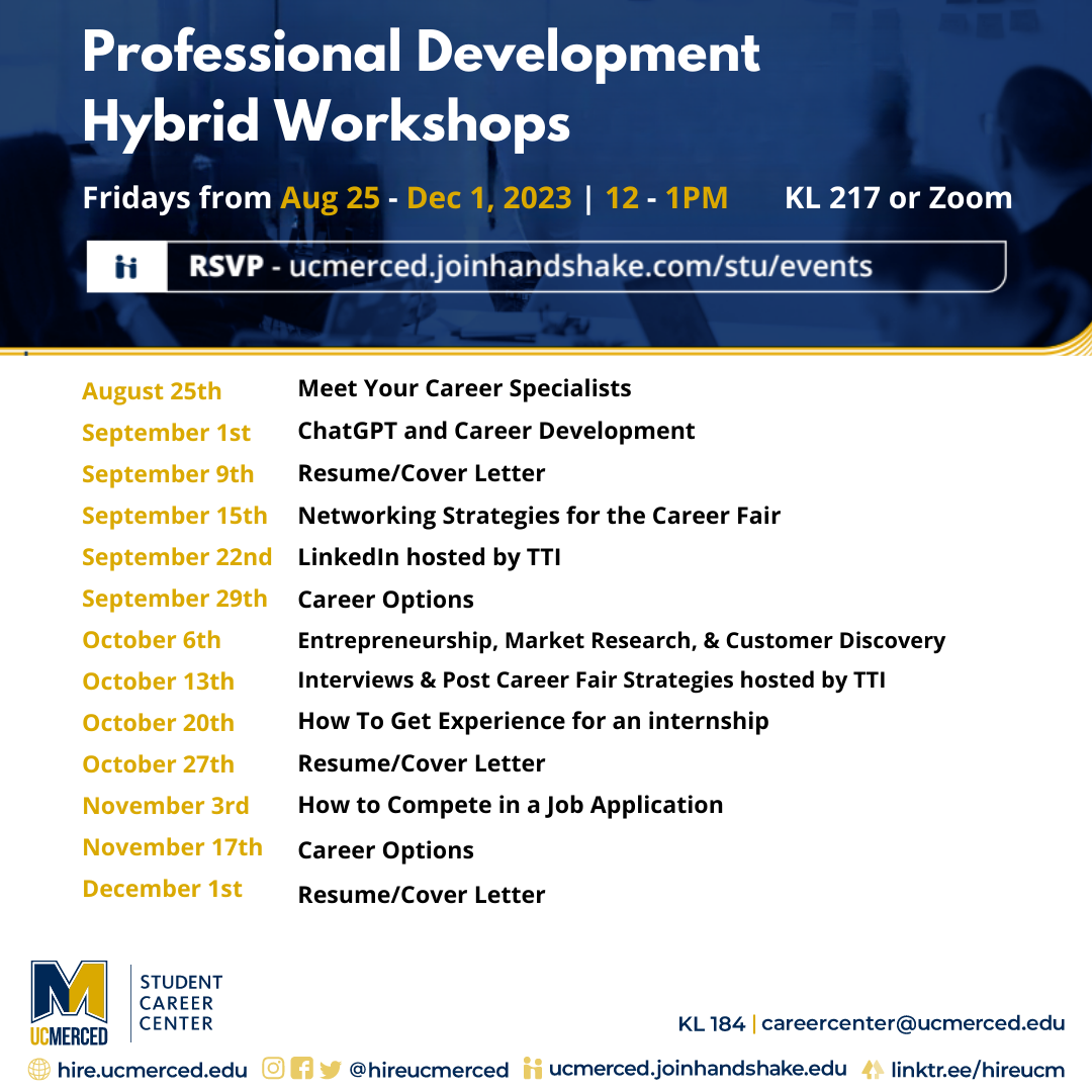 This Fall, The Student Career Center is pleased to support the Career Development of your Student Employees. The attached flyer details weekly workshops on key career topics. Please share with your student employees as professional development opportunities. These workshops will help connect their student employment experience with you to their career development journey.