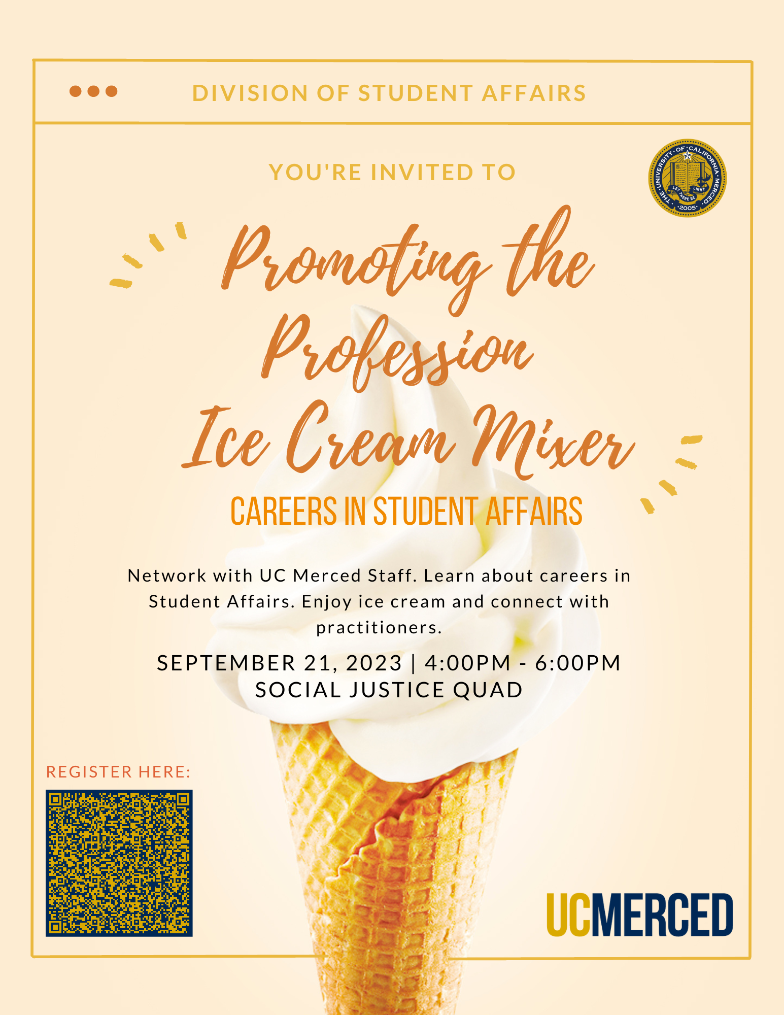 The Division of Student Affairs is hosting an Ice Cream Mixer on September 21st to introduce various career paths to students interested in Careers in Student Affairs. Many of our Student Employees may be interested in talking with UC Merced Student Affairs professionals to learn more.