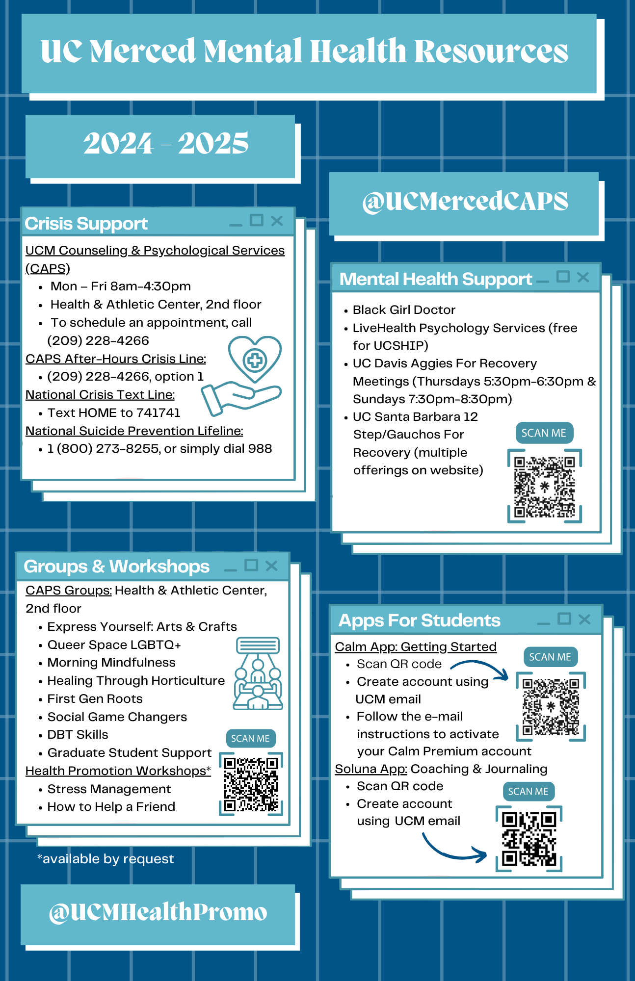 I hope everyone is having a great start to the semester. We have our new Mental Health Resources Poster ready for distribution across campus (please see attached). If you have one from last year, please recycle it since there have been updates to this new version. If you would like a physical copy, please let me know and I would be happy to drop it off (we have plenty to share). The physical copy is 11x17 on thick and glossy paper. We hope this resource will be helpful and shared with your colleagues to better support our students.