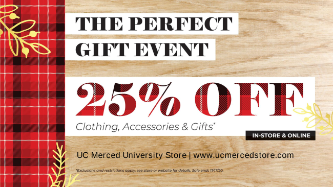 With the holidays here before we know it, now's the perfect time to get that Bobcat-themed gift you've been eyeing for a loved one, or just to treat yourself! During the Perfect Gift Event, running Wednesday, Nov. 11 - Tuesday, Nov. 17, receive 25% off your entire purchase of select* clothing, accessories, gifts and collectibles, in-store and online at www.ucmercedstore.com<http://r20.rs6.net/tn.jsp?f=001V3e2VliVcF5xLFqSI3cyAoZ9qV9MJhjhecoiolnFWWHJlaFoqGuMzxNXOyIXTDE4LnBiHsajkqSyxYsJxtL_OVG9SEgIyqpukvmsAWw-Ng0L8tdC9238w3i9omDP0I5_mKXSPD13LfDDMY5bg4DDePMF3lKieP0aNr6VgoJgFC4=&c=Wtqjr_SL2EUo9BGIGTi5e1b-BD7To1Gp2rPFM0Vp-8QjLRK3YvBbIw==&ch=b6gPv1d2WoZ36KOGR-Yo1QnrMNl7mVgvN_QX1OUxUUhkGilPd-TbMQ==>. Clearance items are included!
